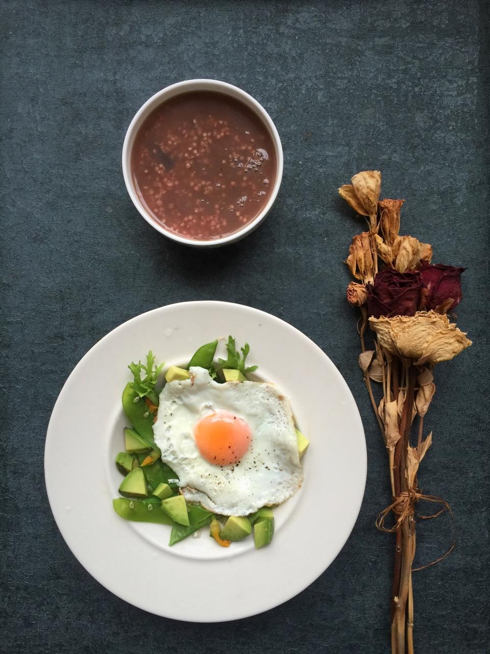 今日早餐:小米红豆红枣粥、牛油果沙拉&水煎蛋