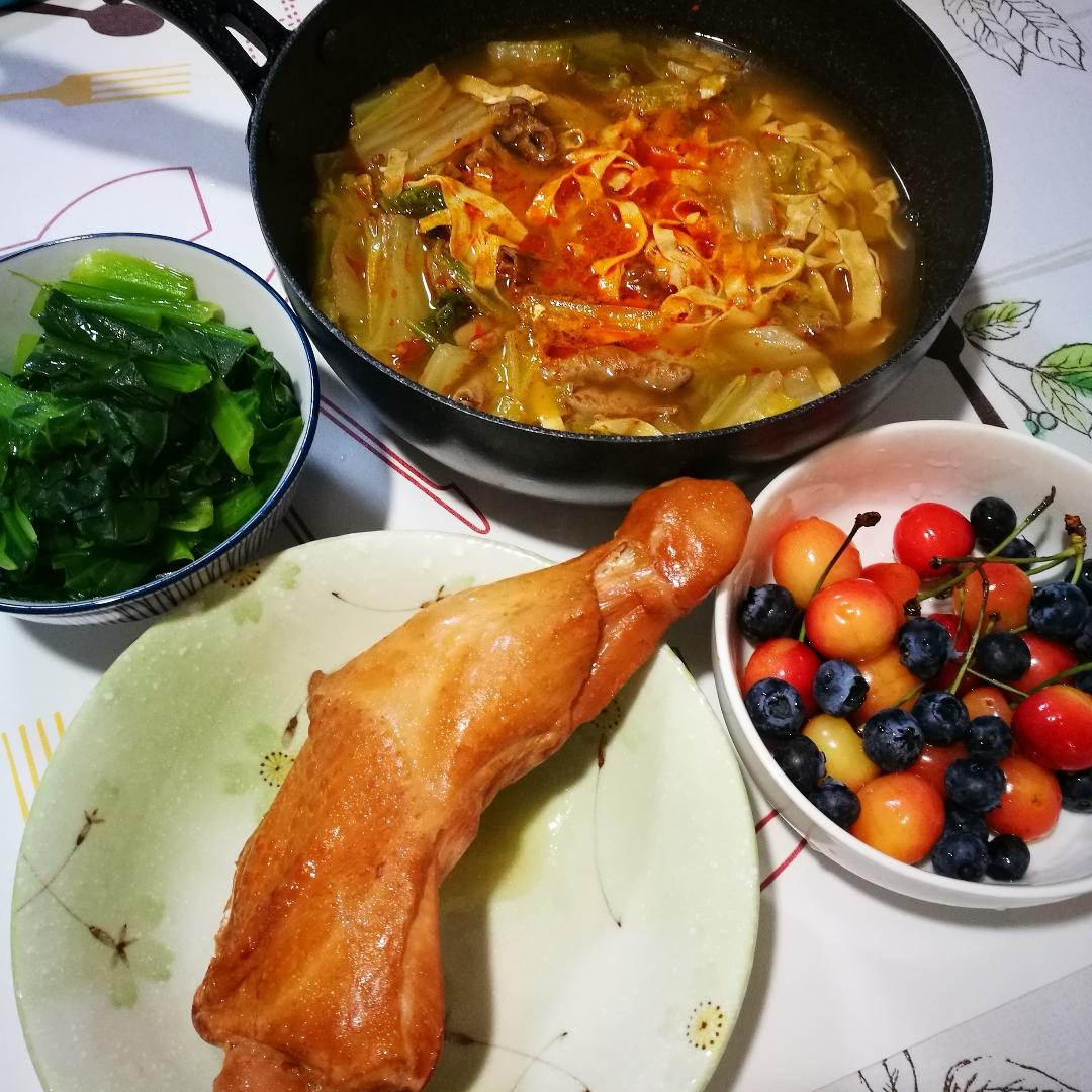 晚餐,牛奶燕麦,酸奶和沙拉是我的,老公骗了我搞得给他下了超大一盆鸡汤面,...