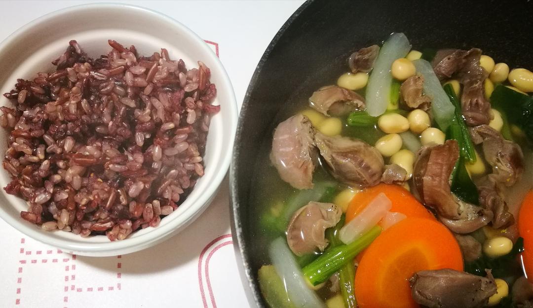 最后一个月要好好控制饮食,目前56kg,杂粮饭,胡椒盐腌的鸡胗,煮萝卜胡...