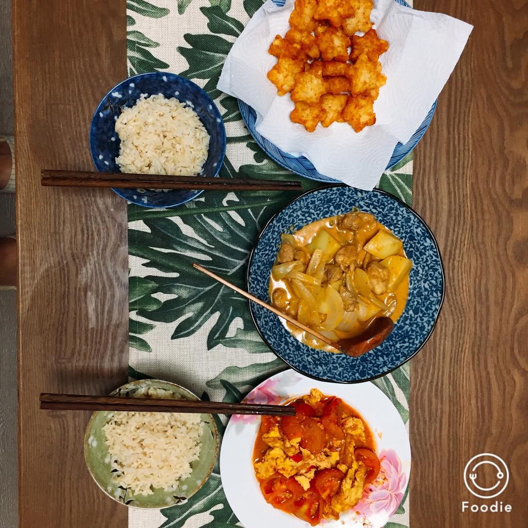 炸薯饼,咖喱鸡肉,番茄炒蛋