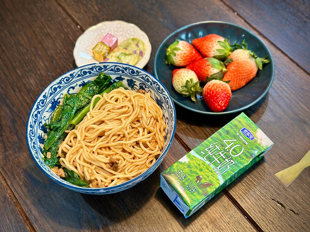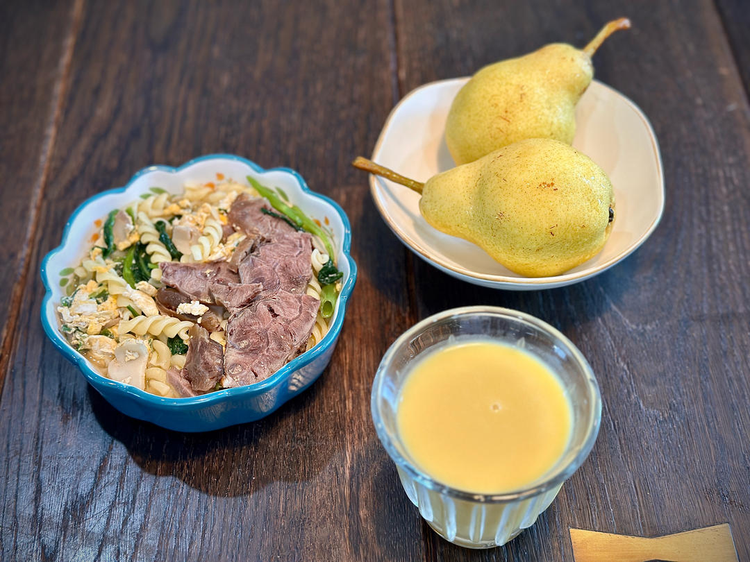 肥牛面、水果、牛奶
