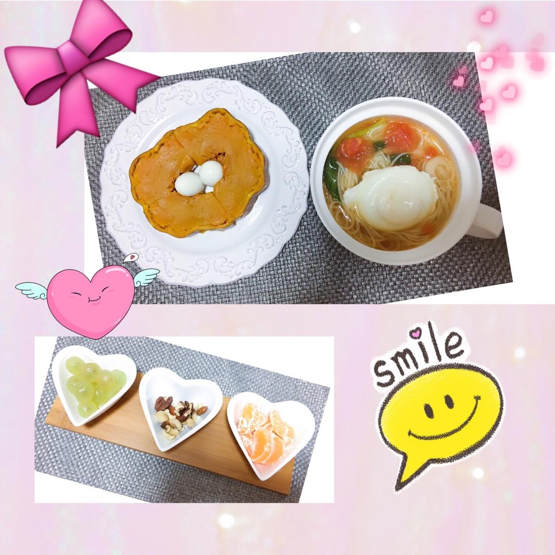8️⃣期:🍅西红柿面荷包蛋➕🌺蒸南瓜➕水果🍇橘子🍊➕坚果🎉🎉🎉橘子🍊➕坚果🎉🎉🎉
