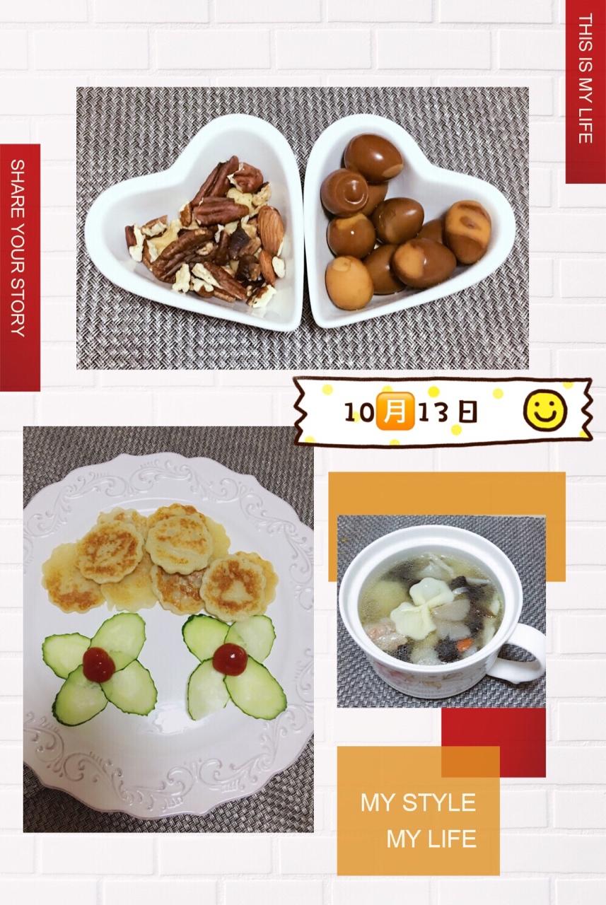 1️⃣1️⃣期:排骨汤手擀蝴蝶面➕😄土豆泥饼➕自制卤鹌鹑蛋➕每日坚果🔆🔆🔆