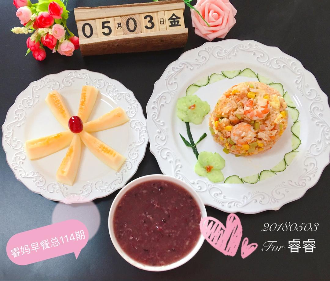 今日早餐:虾仁蛋炒饭➕黑米粥➕蜜瓜🌺🌺🌺