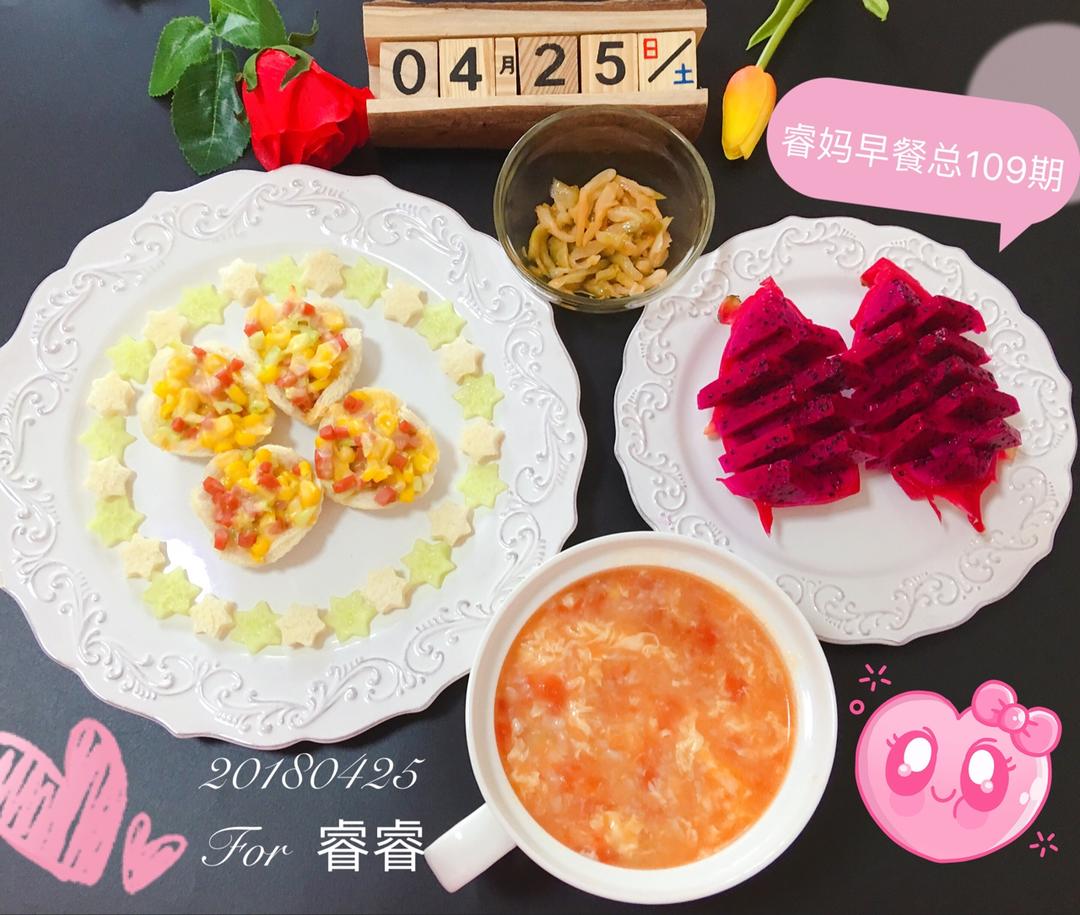 🐶年3️⃣5️⃣期早餐:🍅番茄鸡蛋面疙瘩➕吐司披萨盏➕❤火龙果➕小菜🌺🌺🌺
