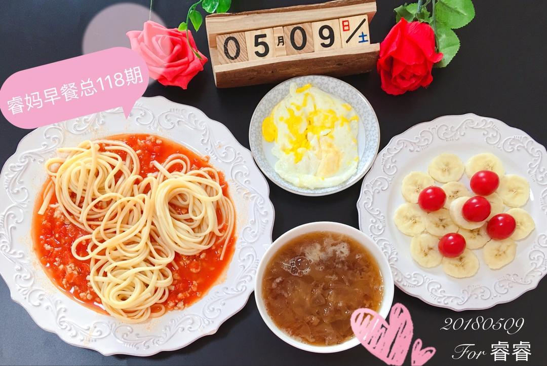 周三,早餐:🍅番茄肉酱意大利面➕红枣银耳羹➕煎蛋➕香蕉千禧水果拼🌺🌺🌺