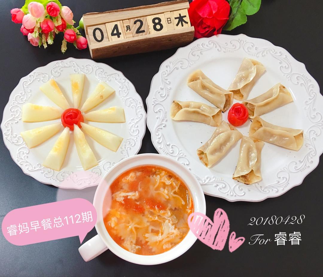 🐶年3️⃣8️⃣期早餐:番茄鸡蛋蝴蝶面➕手工锅贴➕蜜瓜🌺🌺🌺