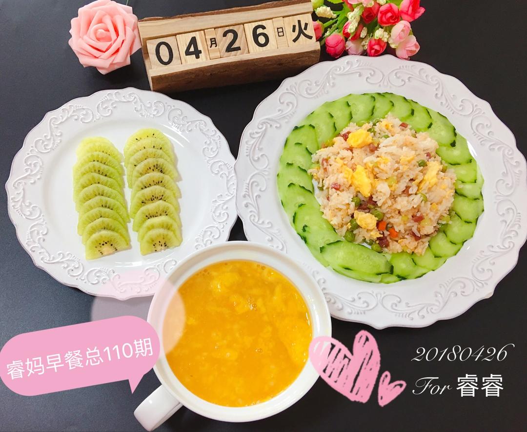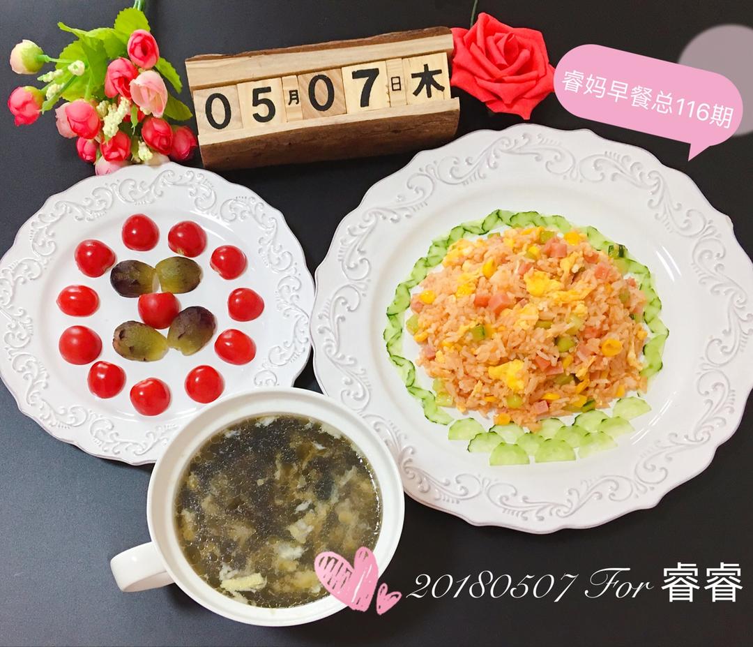 今日早餐:田园炒饭➕紫菜蛋花汤➕千禧黑加仑水果拼🌺🌺🌺
