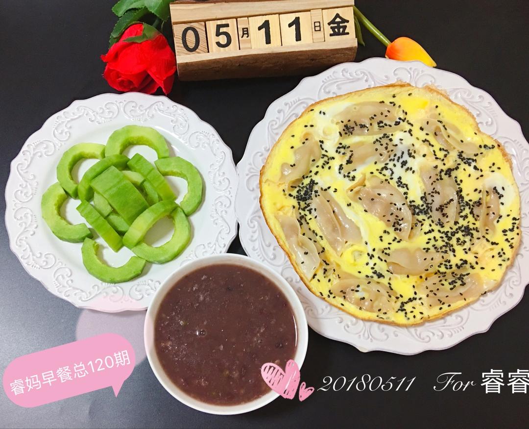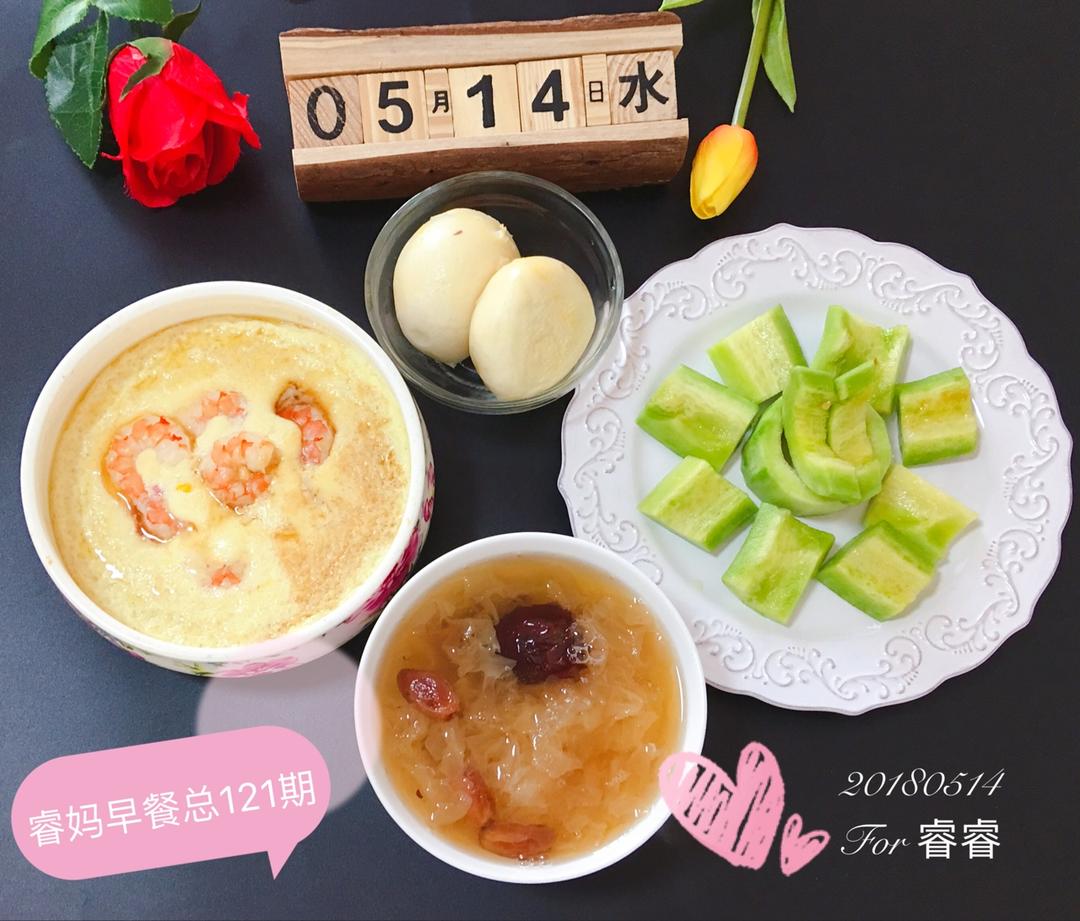 今日早餐:虾仁蒸蛋,红枣银耳羹,豆沙包,酥瓜