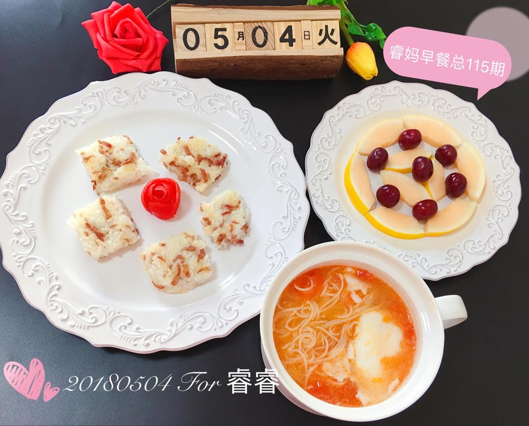 今日早餐:番茄鸡蛋面➕培根兹饭糕➕水果拼🌺🌺🌺