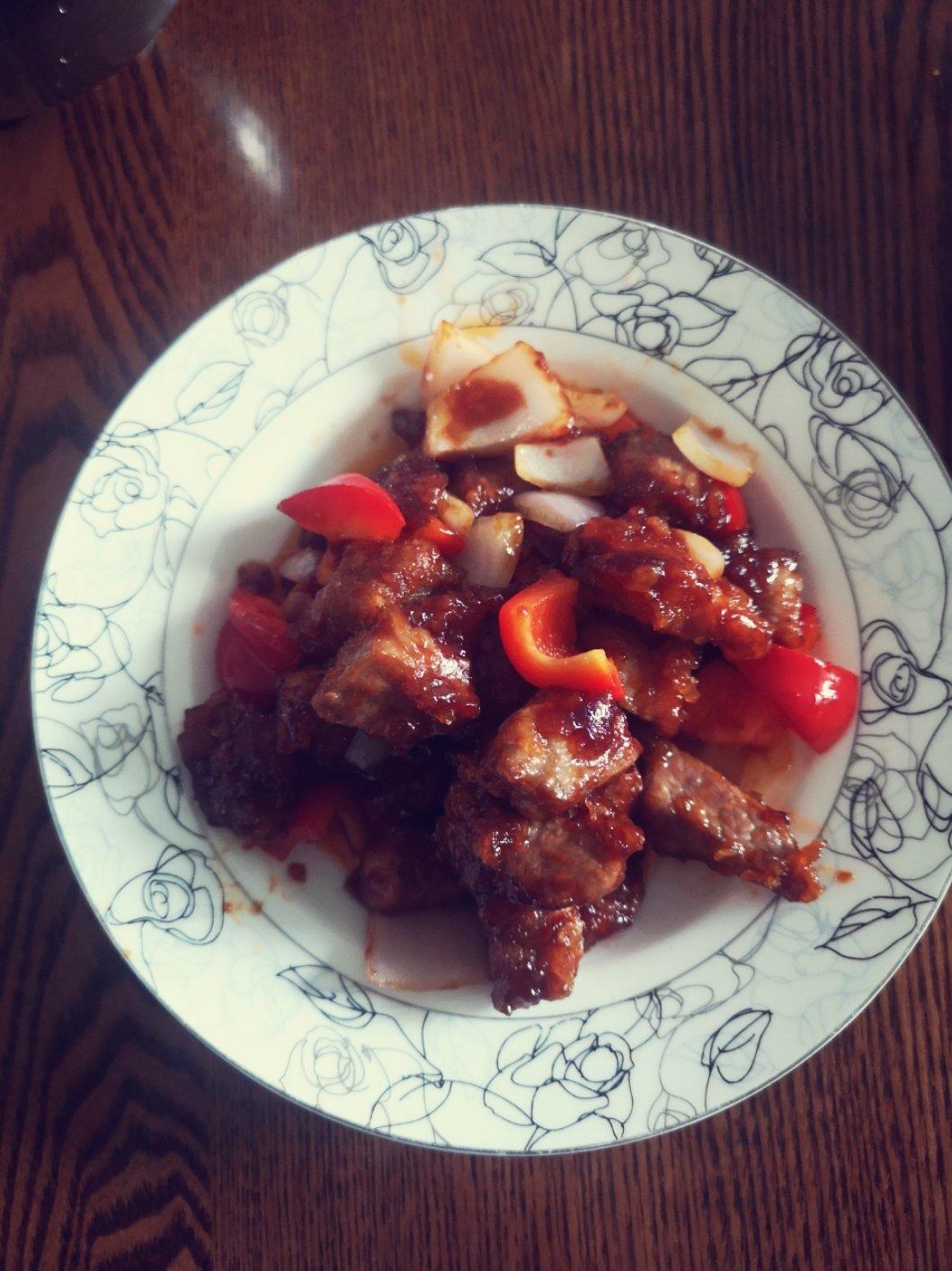 调的汁有些浓,炒了之后成块了。味道有点咸,建议腌制肉时不放酱油,或者调汁时不放酱油。放了两勺糖,甜度足够了。