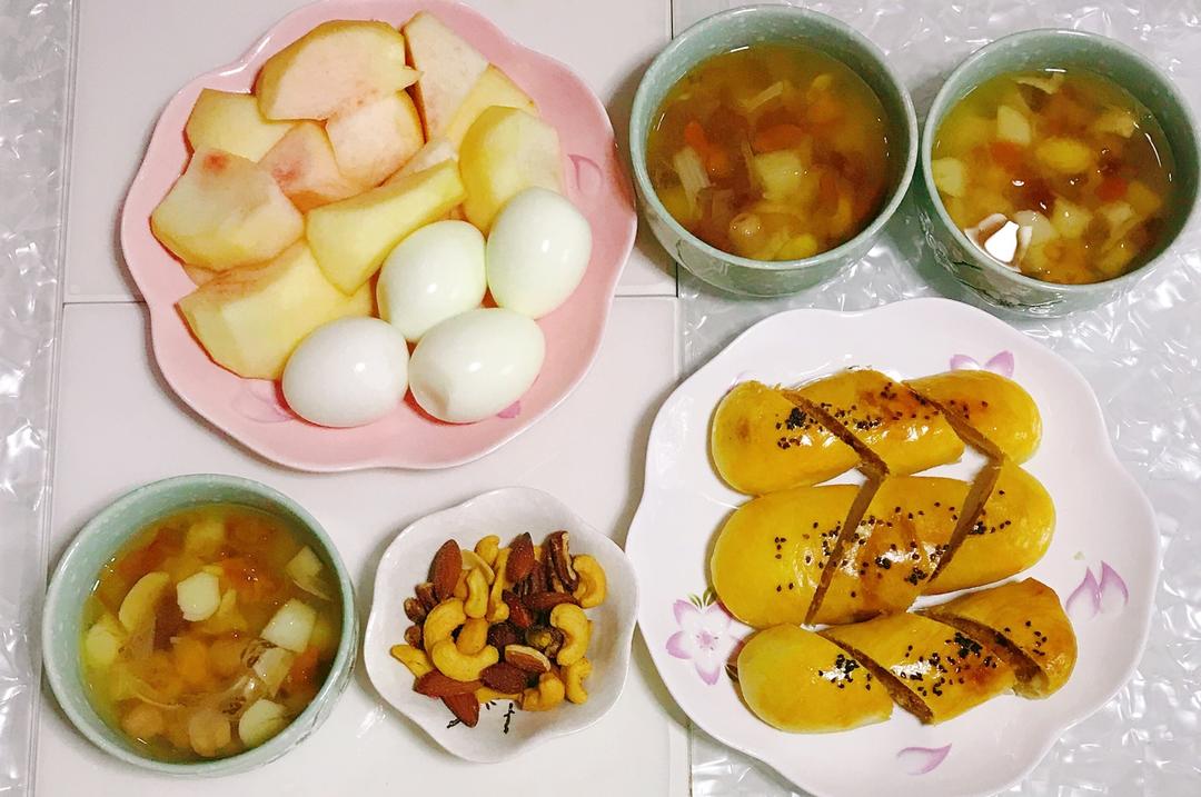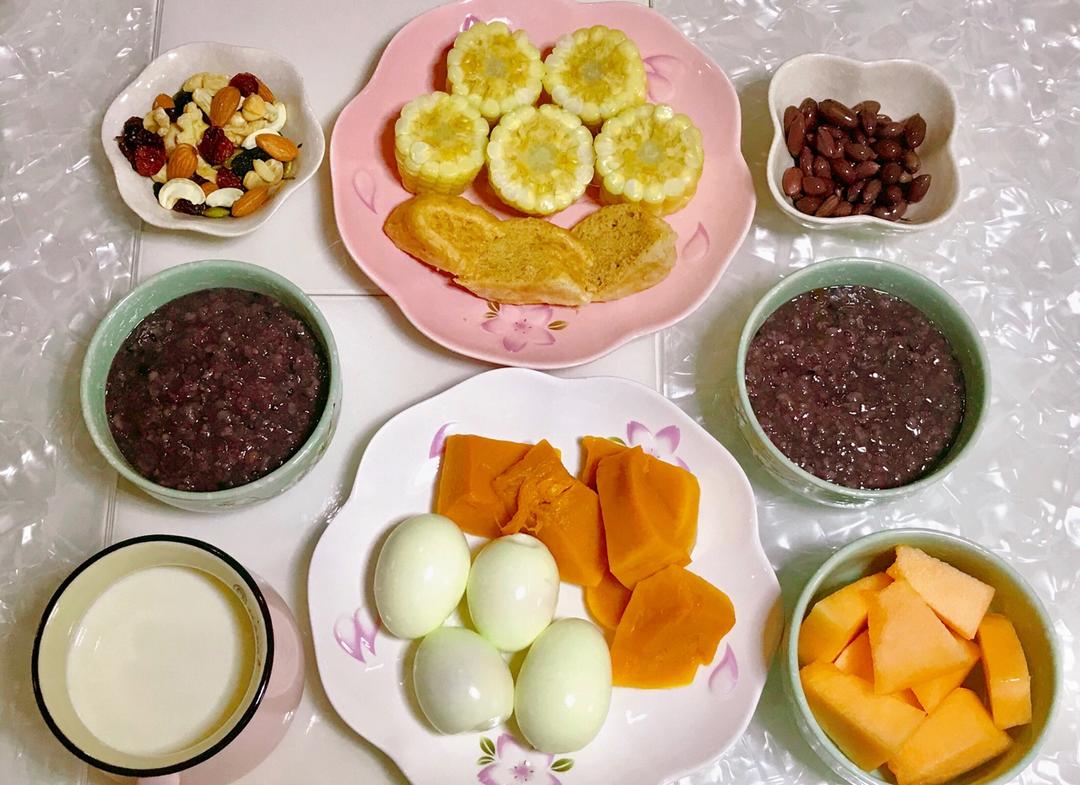 周日早餐:紫薯杂粮粥🍠牛奶🥛煮玉米🌽红糖全麦馒头片煮南瓜🎃煮鸡蛋🥚坚果🌰哈密瓜🍈