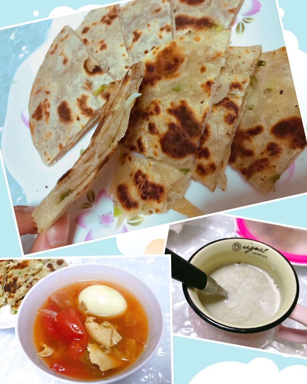 元气早餐-飘香葱油饼,泡菜汤,黑豆豆浆🌮