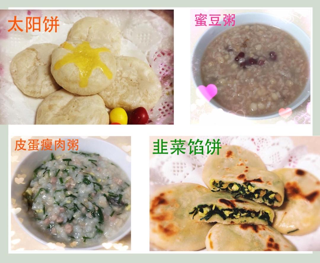 元气早餐-甜口:太阳饼配蜜豆粥;咸口:韭菜馅饼配皮蛋瘦肉粥🍵