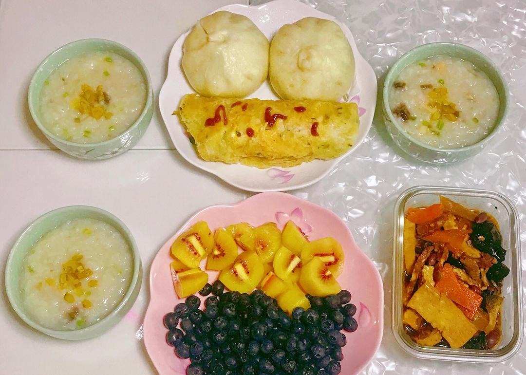 周一早餐:肉包子🍖手抓饼蛋卷🌮海鲜皮蛋粥🦐家常豆腐🍲蓝莓猕猴桃水果拼盘🥝