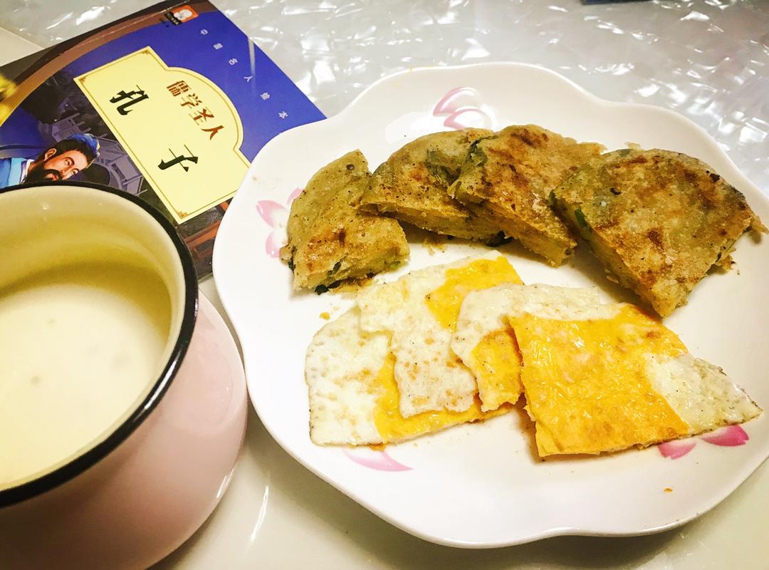 周二早餐-葱油饼,燕麦牛奶,煎鸡蛋🍳