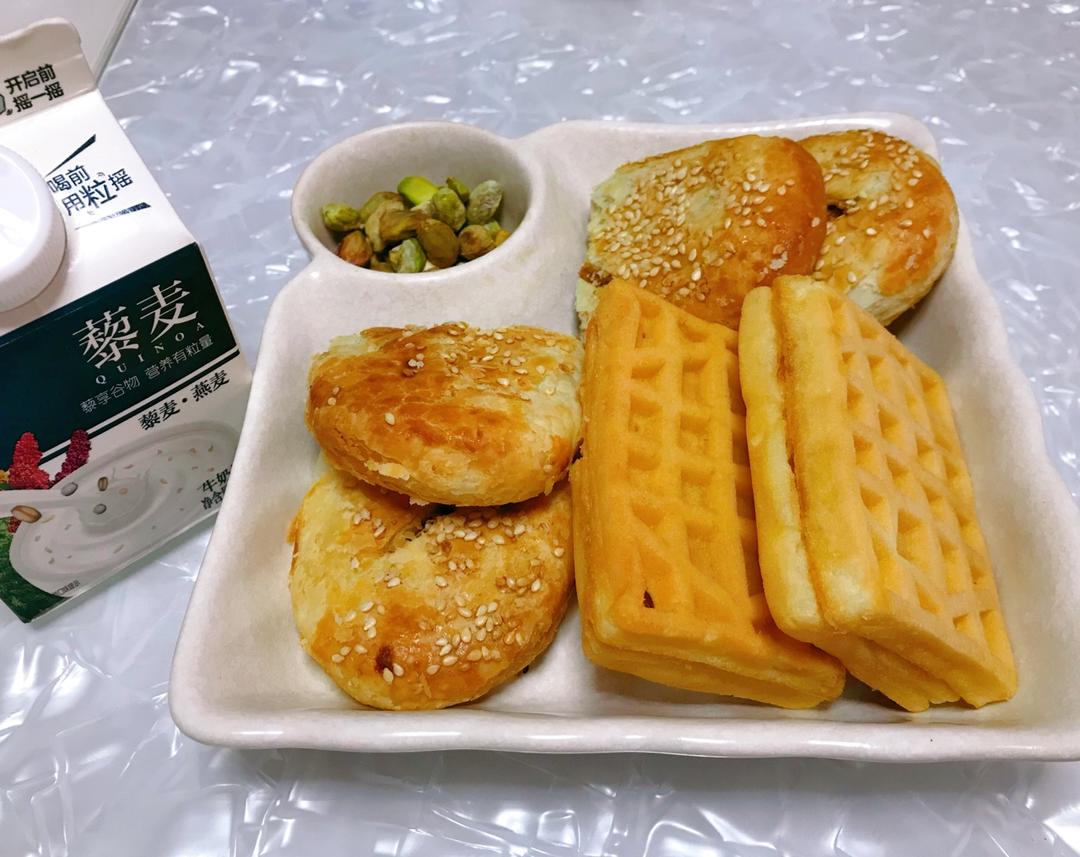 周五早餐-花生酱华夫,肉松酥,坚果藜麦牛奶🥜