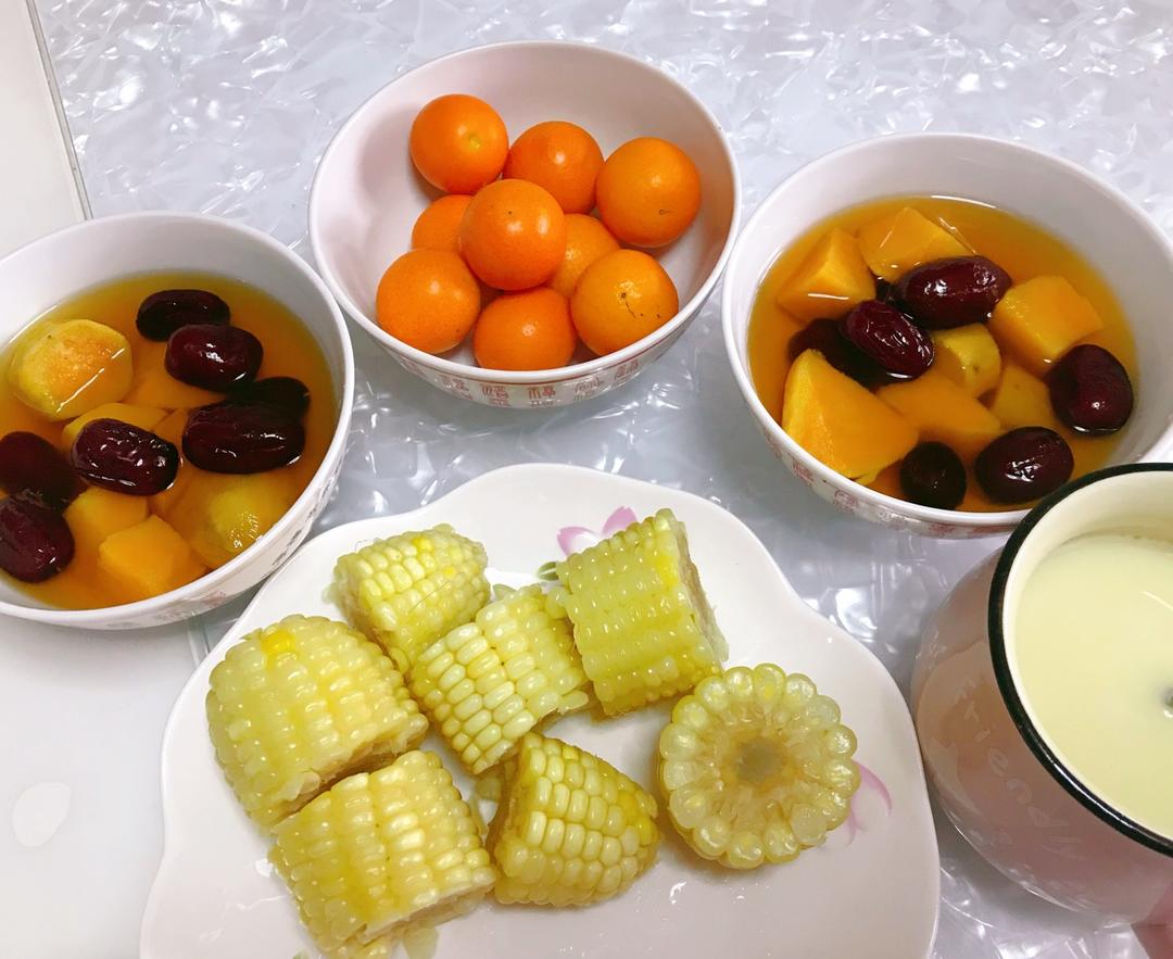 元气早餐-玉米,番薯红枣汤,豆浆,金桔