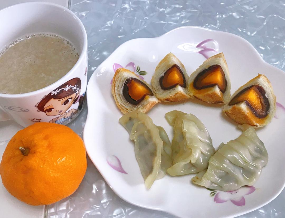周五早餐-蒸饺,蛋黄酥,燕麦牛奶,橘子🍊