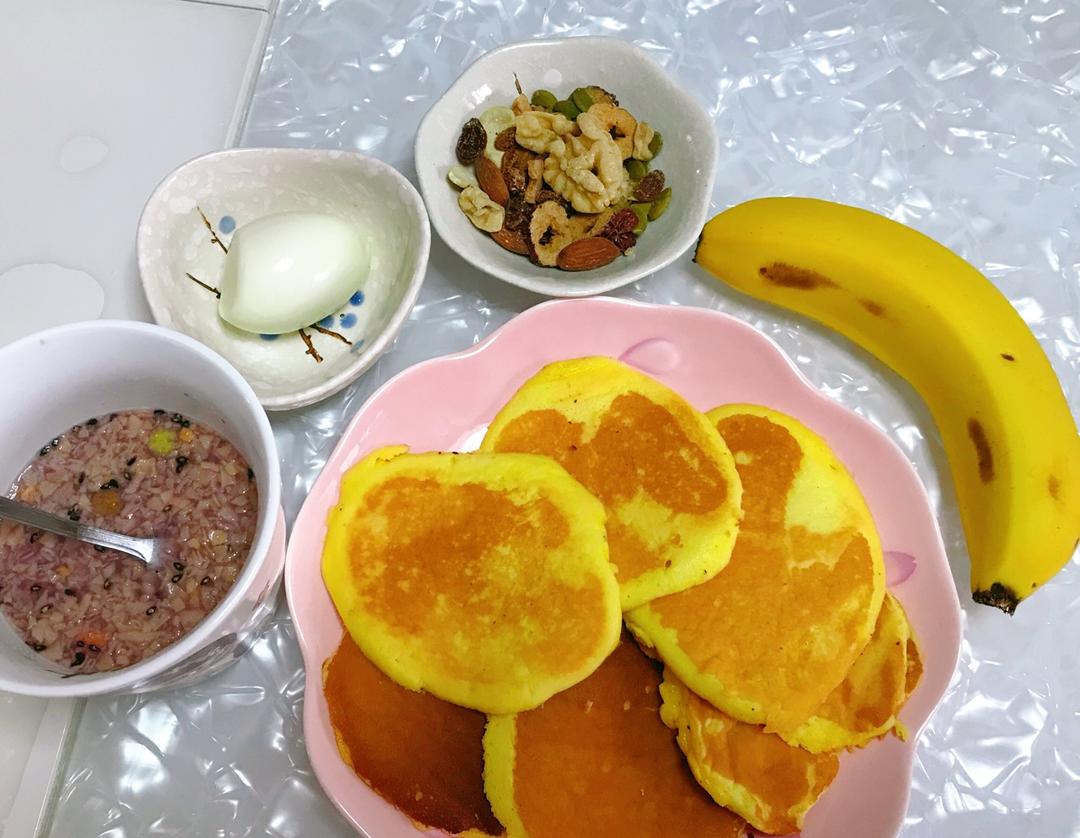 周三早餐-舒芙蕾,煮鸡蛋,坚果,紫薯燕麦粥,香蕉🍌