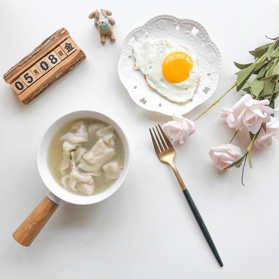 云吞一碗+煎鸡蛋+面包一片(进肚)