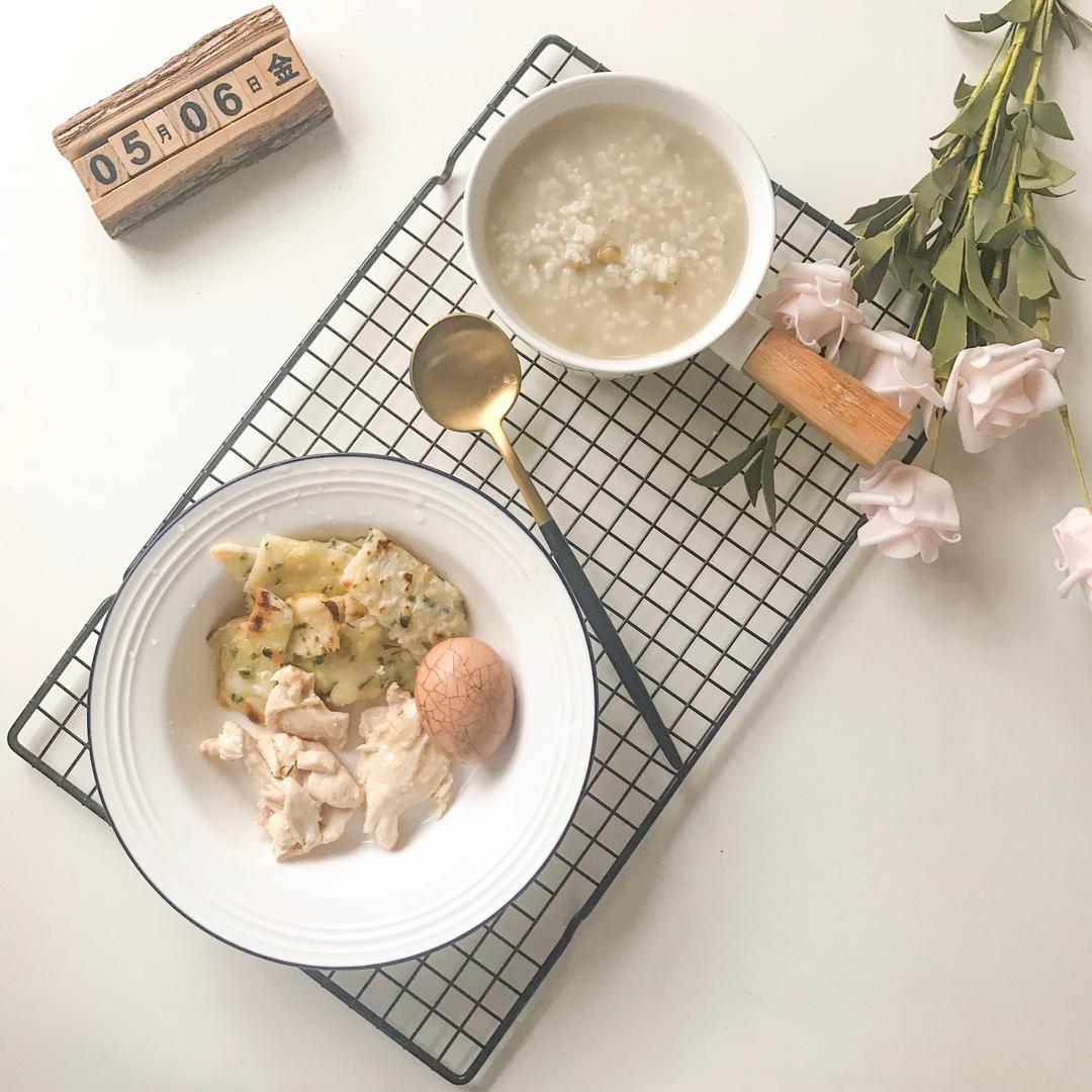 绿豆粥+茶叶蛋+水煮鸡肉+葱花饼 #早餐•2018年5月...
