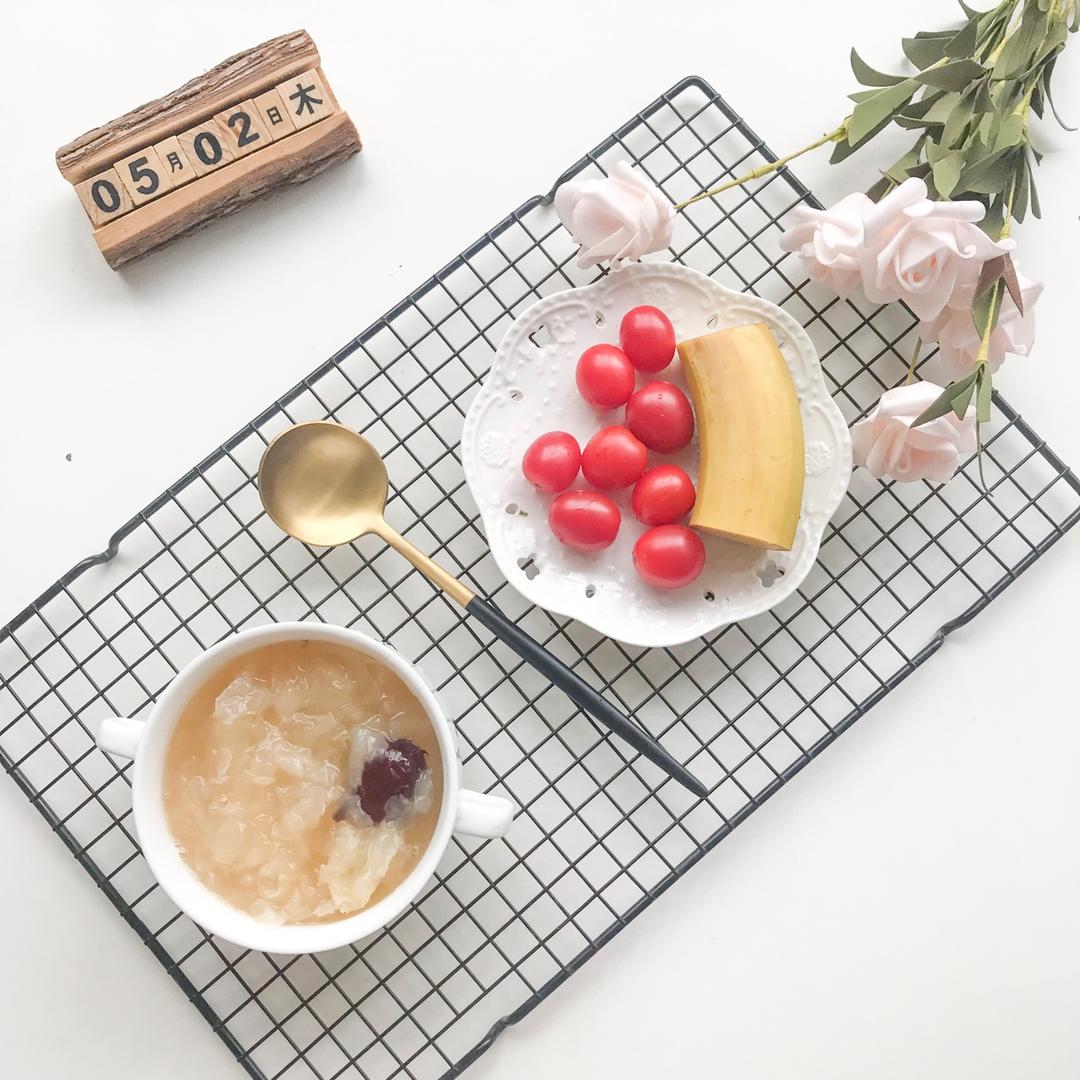 银耳羹+小番茄+香蕉,还有吃光的火腿一...