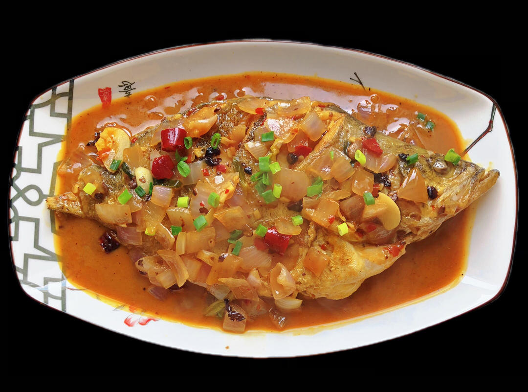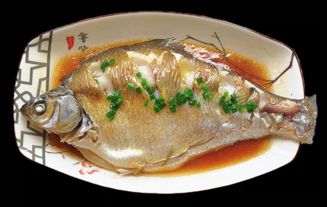 清蒸鳊鱼、鱼籽烧丝瓜、茼蒿、包菜。