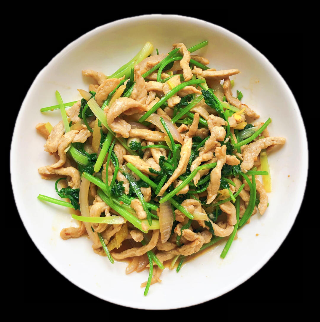 泡椒香菜肉丝、生菜、青红椒炒鸡蛋、空菜、爆鱼。