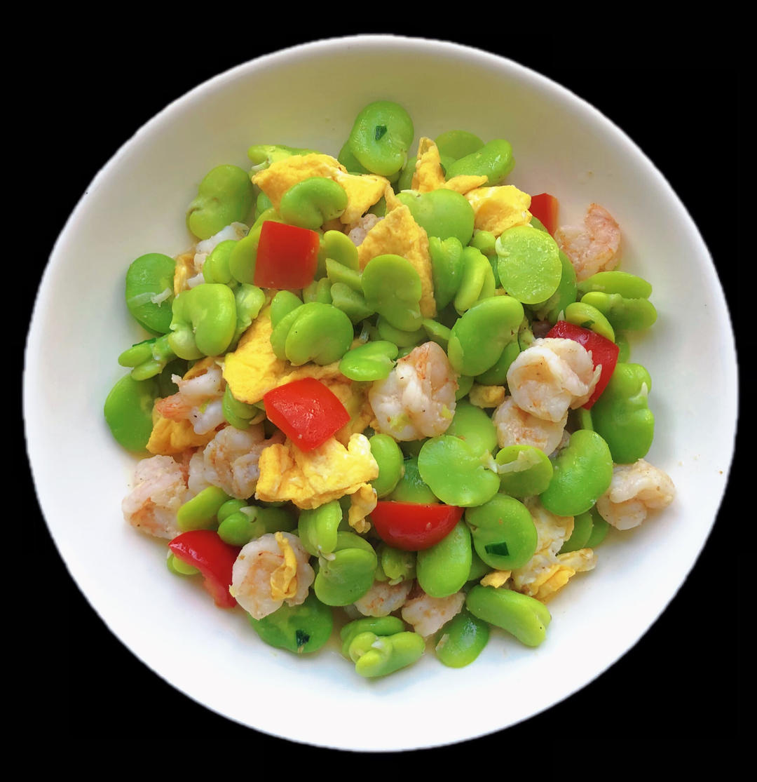 蚕豆米炒虾仁鸡蛋、青椒茭白榨菜炒肉丝、蒜泥空菜。