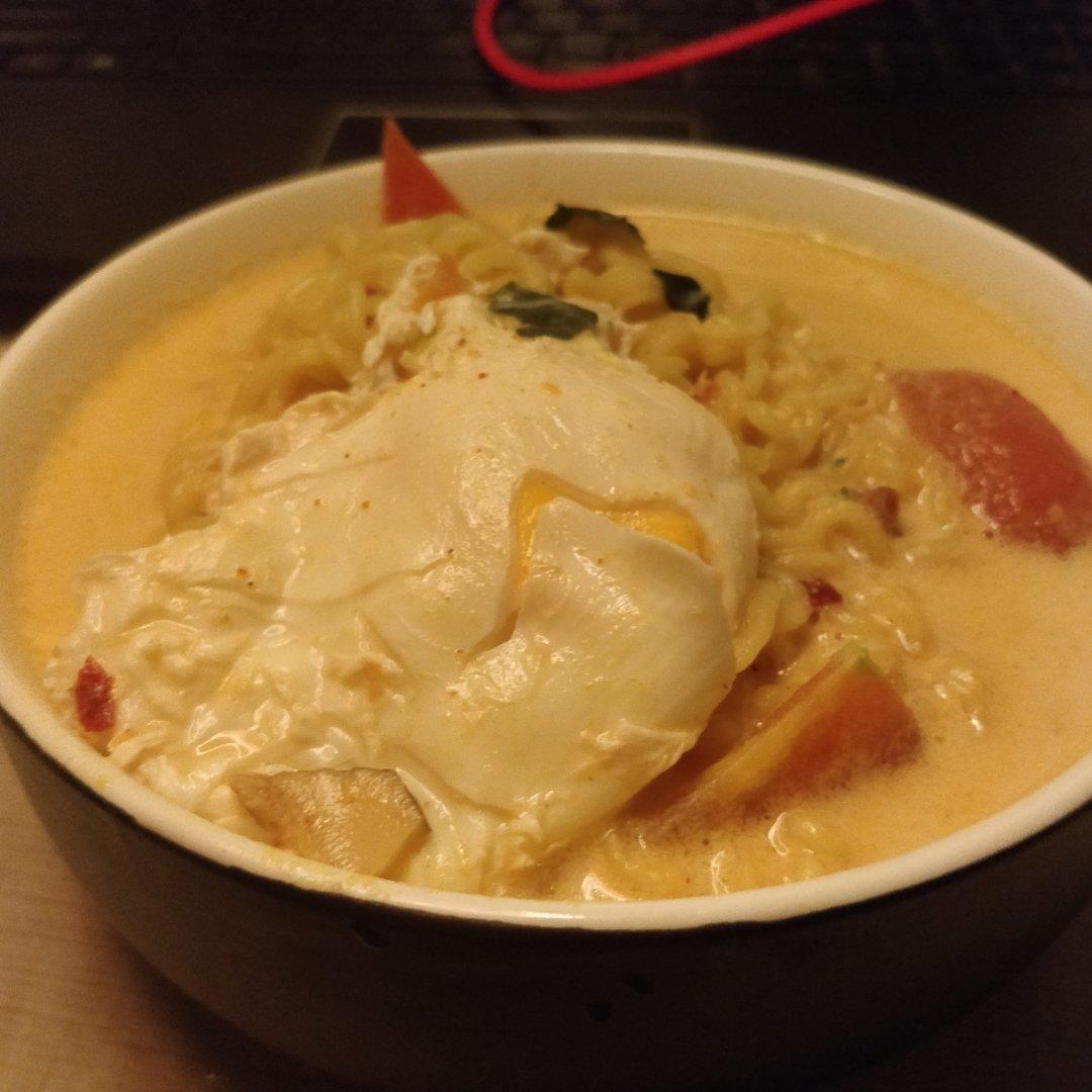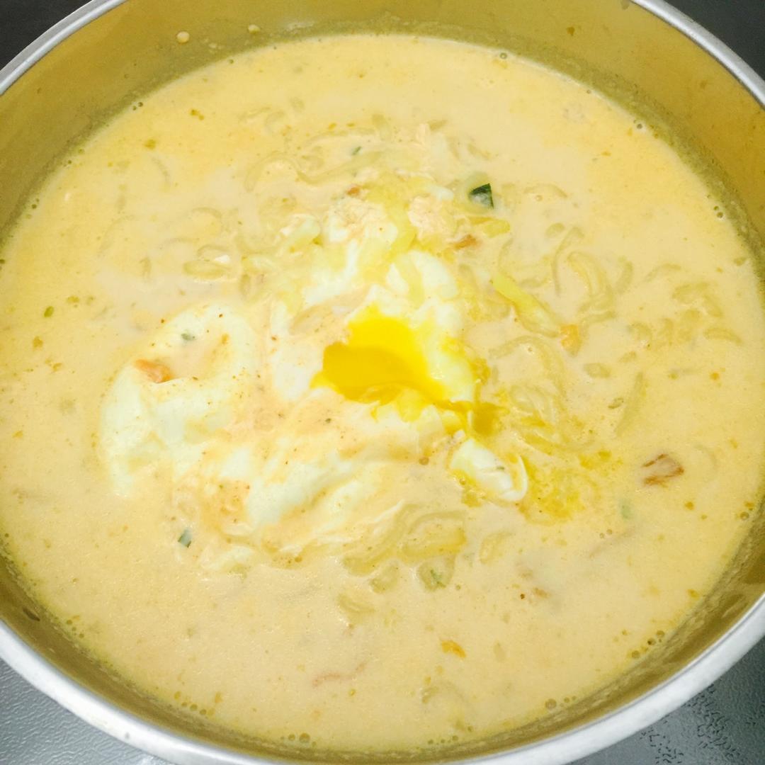 网红牛奶煮的辛拉面哈哈哈,味道还不错,自己加点芝士碎,吃多了有点腻哈哈哈