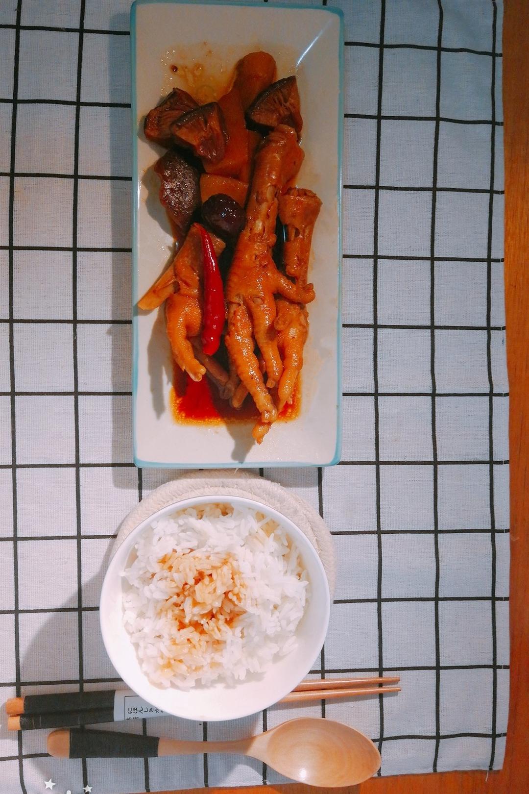 #鸡爪很软烂,土豆和香菇很好吃,把酱汁拌在饭里一...