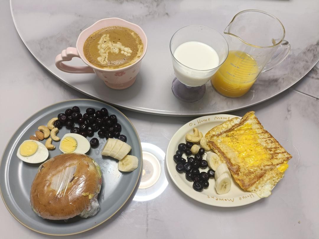 贝果三明治,橙汁,吐司煎鸡蛋
