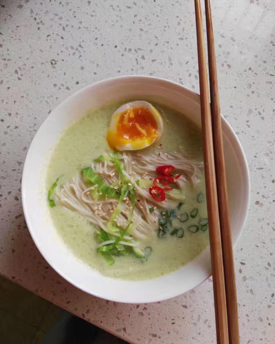 摸灵,豆浆面[调皮]。最近实在没有时间做饭,妈妈剥的青豆米不能浪费掉,打成豆浆做汤底,这碗面又...