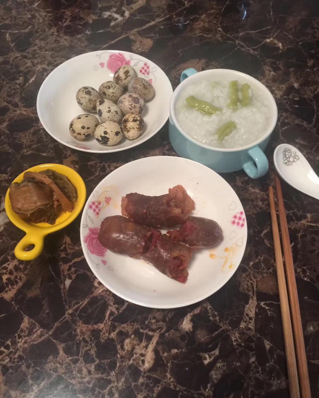 纯中式早餐:四季豆粥、鹌鹑蛋、手撕香肠(不好切就掰[偷笑])、白菜豆腐乳。今天的粥必须来个特写,又稠又绵,难...