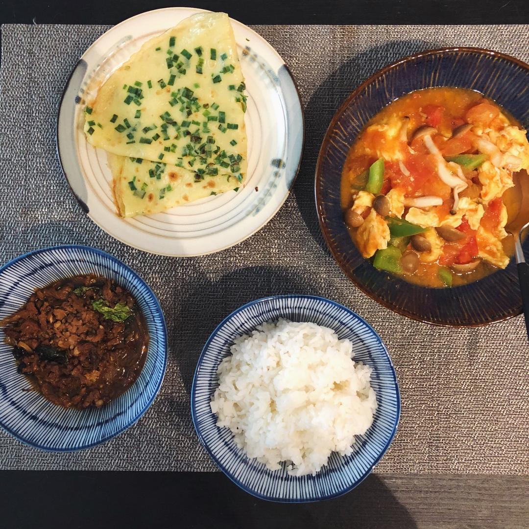 番茄炒蛋&韭菜饼&罗勒炒羊肉末(昨晚的泰餐剩菜