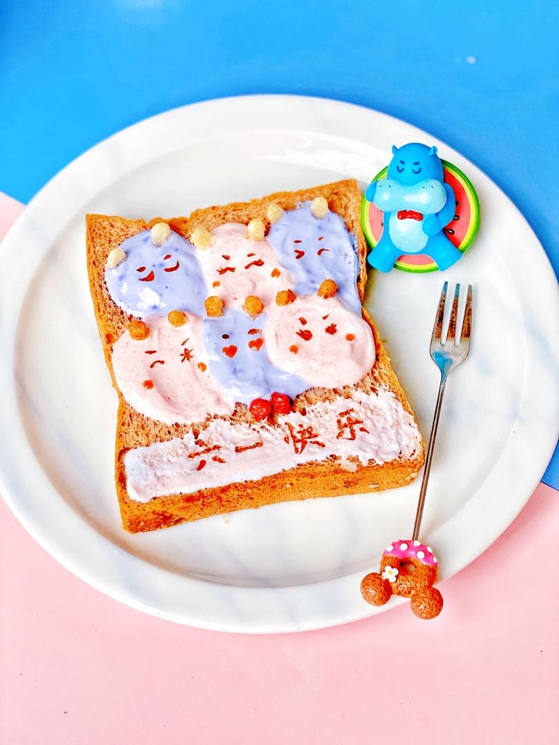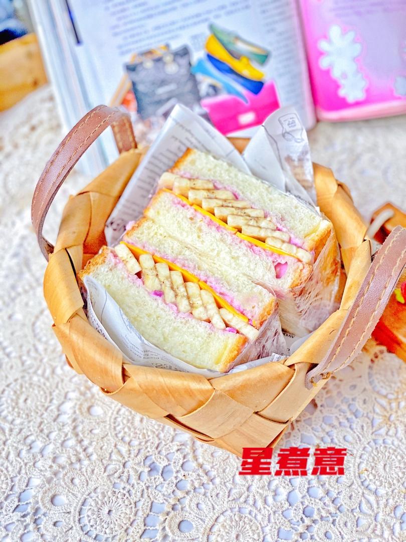 冰箱里剩下一片吐司,一根香蕉,和一点点紫薯泥,加一片芝士片,做了一个美美的三明治,我家妹妹帮忙做的哟!