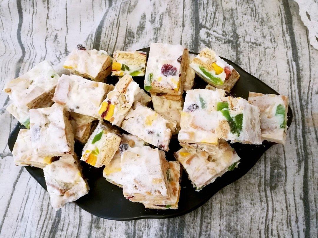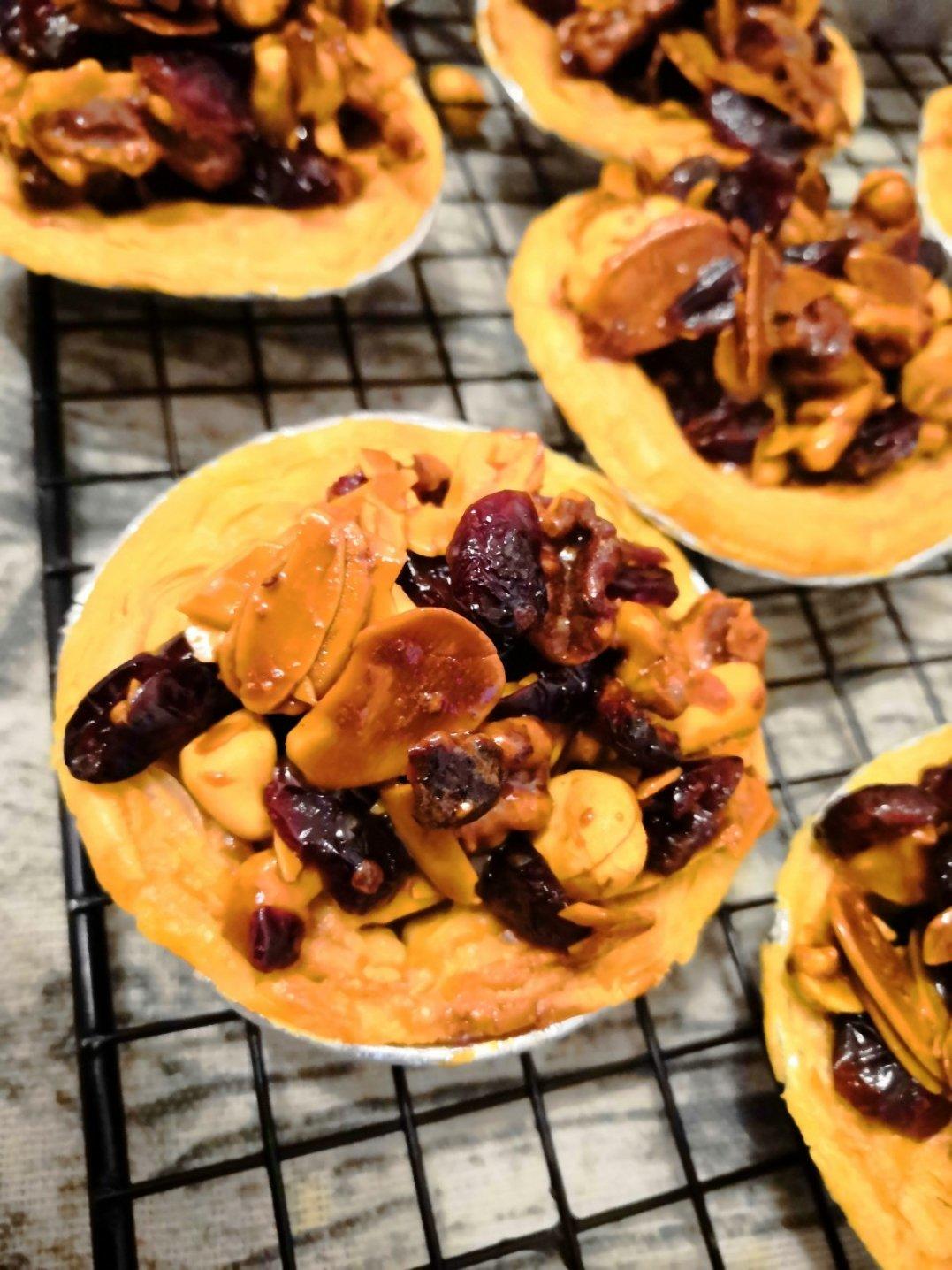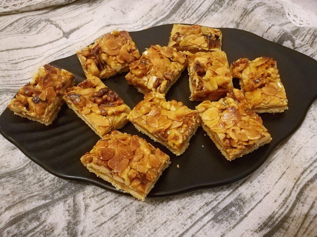 饼底减半,杏仁部分多加了一倍的核桃仁,成品超级好吃,只是不够干,粘粘的,下次用麦芽糖试试...