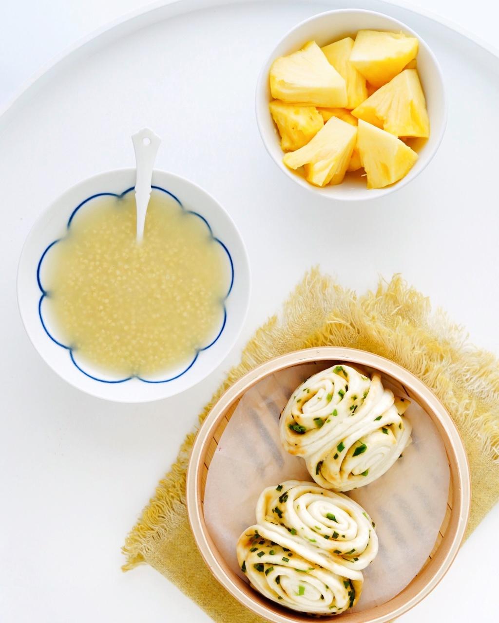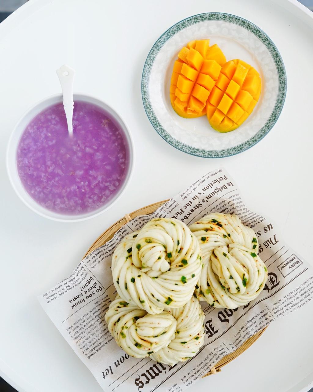 椒盐葱花卷,紫薯稀饭,芒果