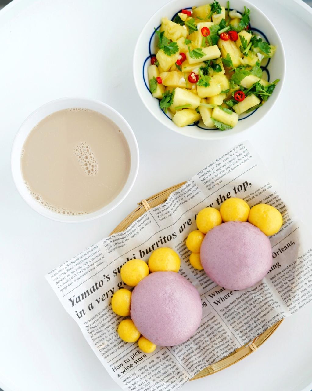 爪爪馒头,凉拌菠萝,豆浆