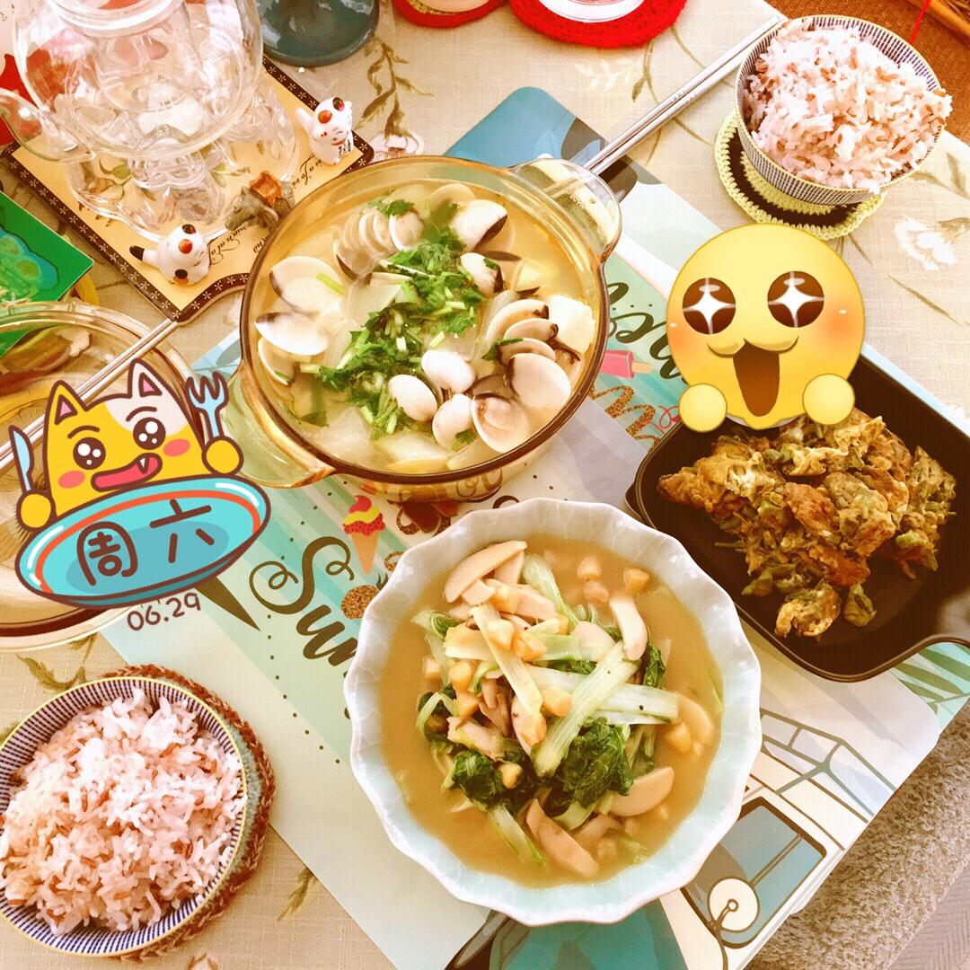 上汤夜香花,瑶柱鲍汁菌笋火腿片,芹菜炒香干,铸铁锅蒸小米香米二米饭#有滋有味,我家的美味...