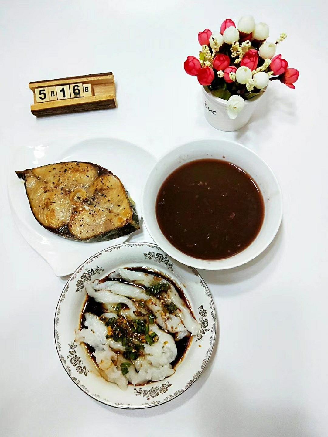 早餐打卡第60天~煎马鲛鱼、紫米红豆粥、自制肠粉
