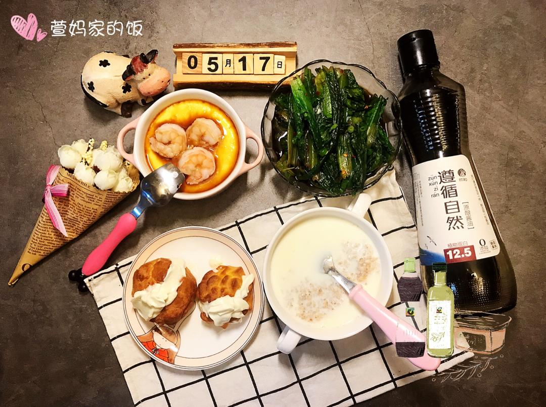 早餐:牛奶麦片、奶油泡芙、虾仁蛋羹、拌蔬菜