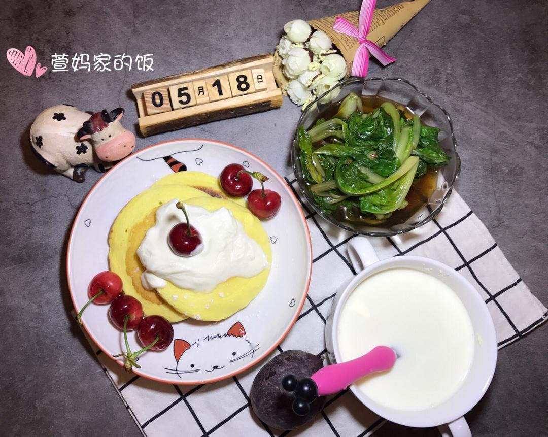 早餐:牛奶、紫薯、舒芙蕾松饼、小白菜、车厘子。