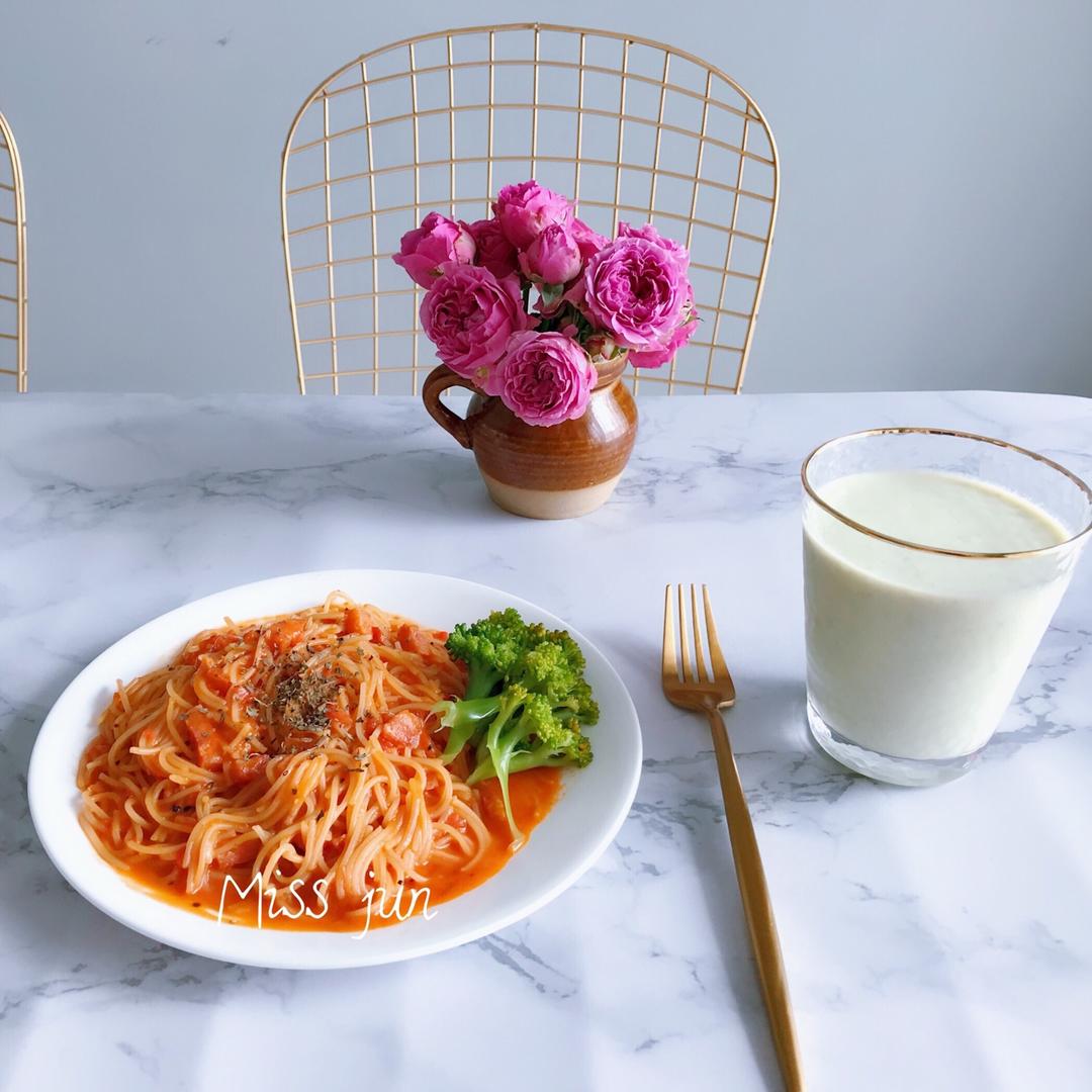 「今日食:番茄意大利面+西兰花+牛油果奶昔」