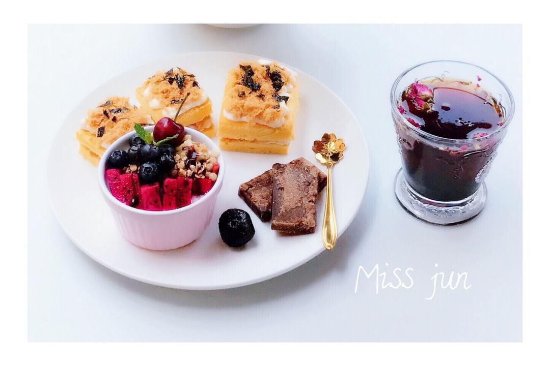 「今日食:芝麻丸+海苔肉松蛋糕+年糕+水果酸奶杯+红糖大枣茶」