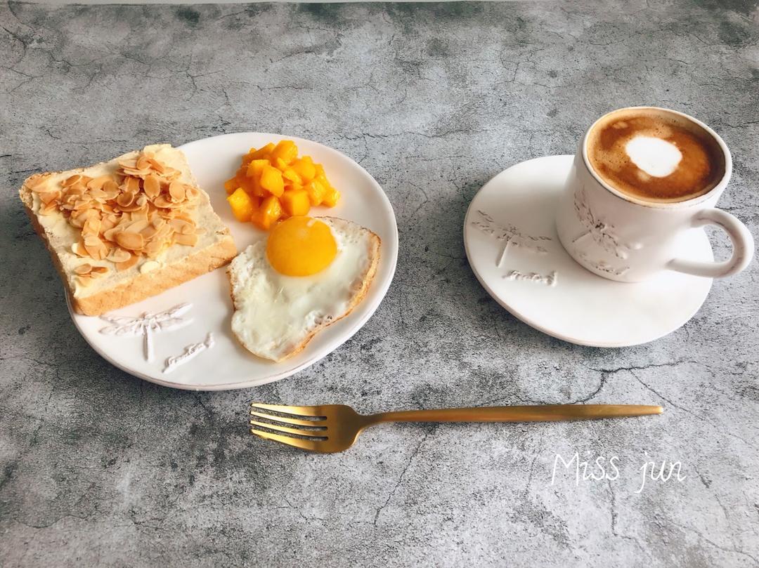 「今日食:焦糖杏仁老奶油面包+煎蛋+芒果+拿铁」