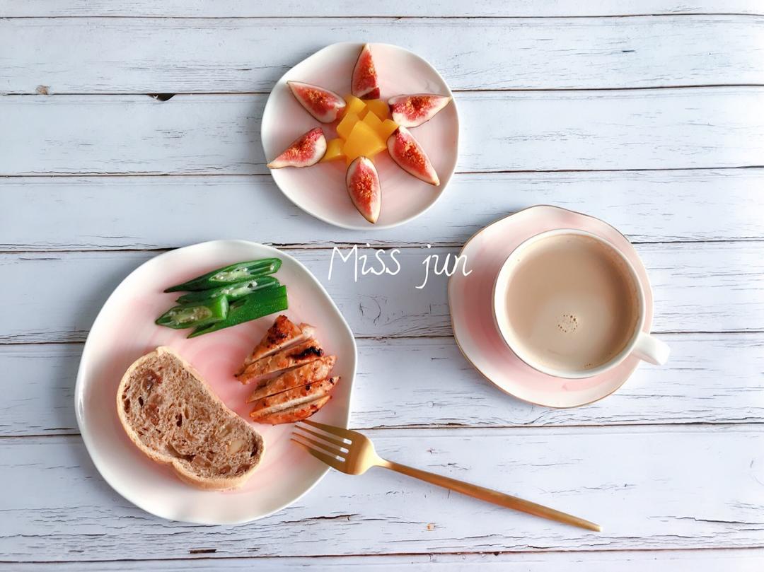 「今日食:黑糖面包+蜂蜜蒜香鸡胸肉+秋葵+奶茶+黄桃+无花果」
