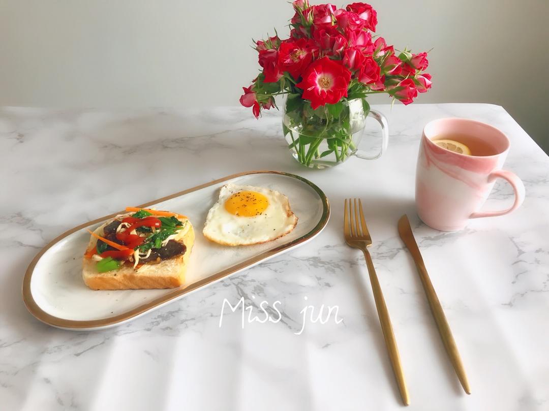 「今日食:开放式三明治+鸡蛋+柠檬蜂蜜水」