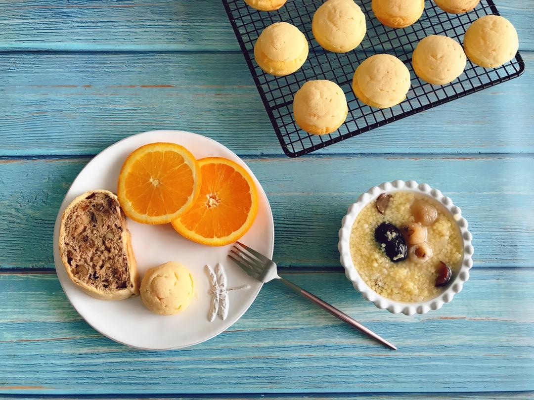 「今日食:黑糖坚果面包+香草泡芙+桂圆红枣小米粥」